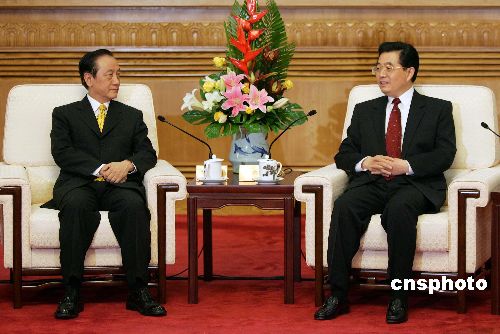 胡錦濤首先代表中共中央,向郁慕明主席和新黨訪問團(tuán)全體成員表示熱烈歡迎和親切問候。