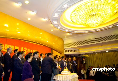 中新社香港七月十二日電(記者邢健)香港民建聯(lián)今天晚上在中環(huán)大會堂舉辦成立十三周年會慶酒會,全國政協(xié)副主席董建華、香港特區(qū)行政長官曾蔭權(quán)、中聯(lián)辦主任高祀仁和外交部駐港特派員楊文昌作為主禮嘉賓,出席了酒會的切蛋糕儀式。