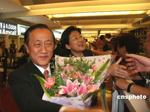 新黨主席郁慕明結(jié)束在大陸八天的“民族之旅”,七月十三日晚間十點(diǎn)左右抵達(dá)臺北,在機(jī)場受到支持群眾的歡迎。作者:路梅