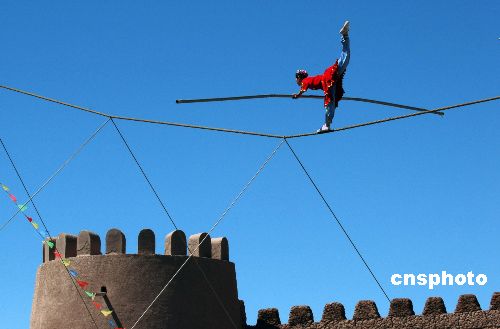 “達(dá)瓦孜”維吾爾語的意思是高空走大繩,古稱“走索”,是新疆維吾爾族傳統(tǒng)的民間雜技表演藝術(shù),源于兩千多年前的西域,據(jù)說在新疆也只有一個(gè)家族從事這項(xiàng)表演,多次創(chuàng)造吉尼斯世界紀(jì)錄的著名藝術(shù)家阿迪力就出生于新疆喀什地區(qū)英吉沙縣,是達(dá)瓦孜傳人。圖為在喀什維吾爾民族風(fēng)情園中表演達(dá)瓦孜的十二歲小姑娘,正在約三十米高的繩索上展示單腿平衡絕技。作者:田地