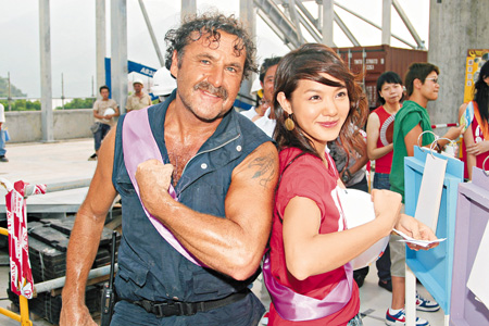 中新網7月19日電 據星島日報報道,港臺“全天候高空工作安全加油站”活動昨日于東涌吊車站地盤舉行,活動上鄭希怡(Yumiko)、官恩娜(Ella)及關智斌與工程人員大玩問答游戲,其間Ella口快快將“下列身體部位”誤說成下體,令身旁的Yumiko和關智斌不禁失笑。