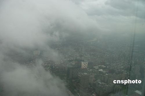 七月十九日,強(qiáng)臺(tái)風(fēng)“海棠”的中心離開(kāi)臺(tái)島,臺(tái)北市依然雨勢(shì)不停。圖為在臺(tái)北101大樓八十九層觀景臺(tái)(三百八十米高)拍攝到的臺(tái)北市容,陰云依舊籠罩臺(tái)北,能見(jiàn)度甚低。作者:董會(huì)峰