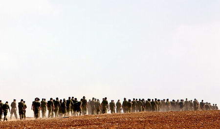 中新網(wǎng)7月20日電 據(jù)路透社報道,2005年7月19日,幾名正在巡邏的以色列士兵列隊走過加沙定居點的一處建筑物。