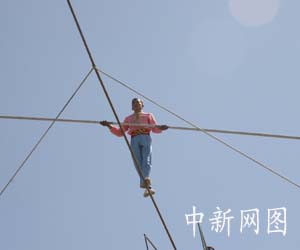 20日中午,16歲的男孩買合蘇正在20米高的空中表演達(dá)瓦孜,引發(fā)記者團(tuán)的陣陣掌聲。英吉沙縣正在建設(shè)一座達(dá)瓦孜學(xué)校,建成后將會招收全國各地的學(xué)員。