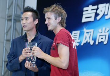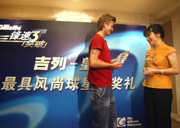 7月22日上午,剛剛獲得“皇馬最具風(fēng)尚球星”稱號的“萬人迷”貝克漢姆出席了此次皇馬中國行的官方贊助商、同時也是這位巨星為之代言的吉列公司在昆侖飯店舉辦的球迷活動——吉列-皇馬最具風(fēng)尚球迷頒獎禮。