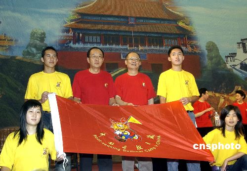 七月二十六日,海外華裔青少年夏令營在北京開營,來自二十九個國家近八百名華裔青少年將在夏令營生活中學習中國民族舞及中華武術的基本常識。圖為國務院僑辦副主任劉澤彭、趙陽為夏令營授旗。作者:韓藝冰