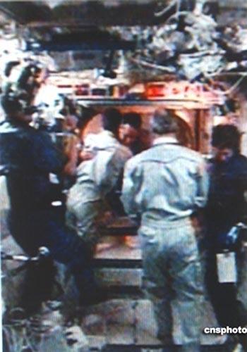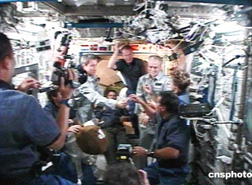 航天飛機(jī)發(fā)現(xiàn)號(hào)是7月28日7時(shí)18分(北京時(shí)間19時(shí)18分)和國際空間站軌道對(duì)接,經(jīng)過密封檢查,機(jī)組于美國東部時(shí)間8:50進(jìn)入國際空間站。七名宇航員結(jié)束了兩天奔向空間站的飛行,這是自美國航天飛機(jī)2002年12月離開后,如今第一次造訪空間站。兩個(gè)機(jī)組會(huì)師太空,相互擁抱問候。