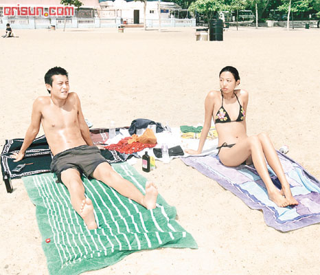 Edison最愛于中午時分、太陽最猛烈時暴曬,昨日他與一位擁有標準模特兒身形的女伴,于一時左右抵達淺水灣,女伴穿上繡花三點式泳裝,相比之下Edison則顯得較為保守,他只赤裸上身,穿上運動型短褲。接著二人各自拿出大毛巾墊于沙灘上,Edison再細心將兩條毛巾并排在一起,然后齊齊享受日光浴。