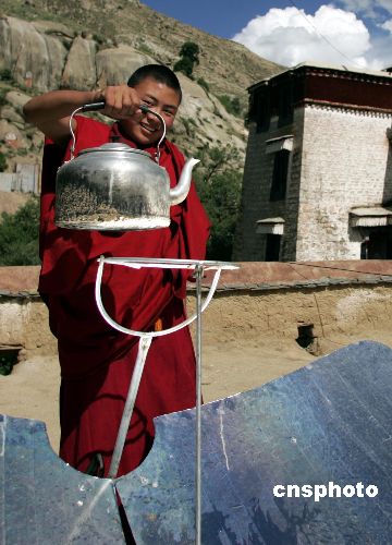 | 夏日的西藏色拉寺,一位僧侶在使用太陽(yáng)能灶燒水。西藏自治區(qū)實(shí)施“陽(yáng)光計(jì)劃”十多年以來(lái),全區(qū)已累計(jì)建立三千瓦至五千瓦的光伏電站三百多座,推廣各類小型獨(dú)立光伏發(fā)電系統(tǒng)約五千四百千瓦,已有近五十多萬(wàn)農(nóng)牧民因此告別了無(wú)電歷史。在西藏,太陽(yáng)能資源已用于照明、通訊、廣播電視、燒水做飯、取暖等方面。作者:武仲林