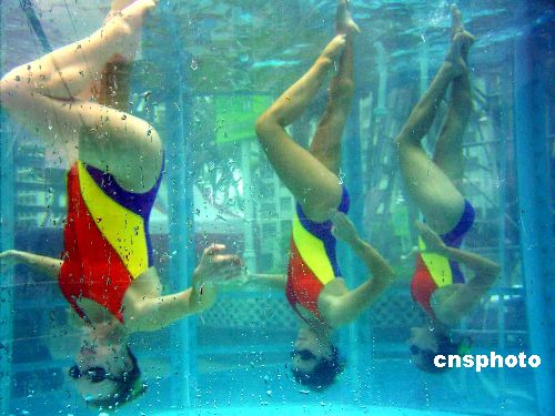 “黃埔夏日跳躍水世界”預(yù)演于29日在香港舉行,多位澳洲好手呈獻世界級花式跳水表演。圖為優(yōu)美花式韻律泳表演。作者:彭兆輝