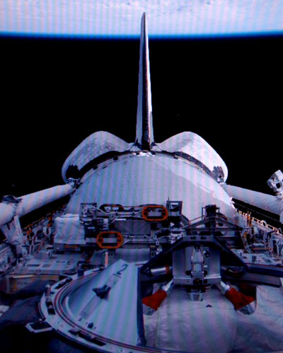 發(fā)現(xiàn)號和國際空間站的宇航員們正在進行一個精彩的工作日。機組使用裝置在航天飛機機械臂上的吊桿傳感器系統(tǒng),伸向機頭近距離觀看下部關(guān)鍵部位,同時對發(fā)現(xiàn)號的絕熱裝置進行了更多的檢查。