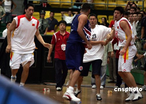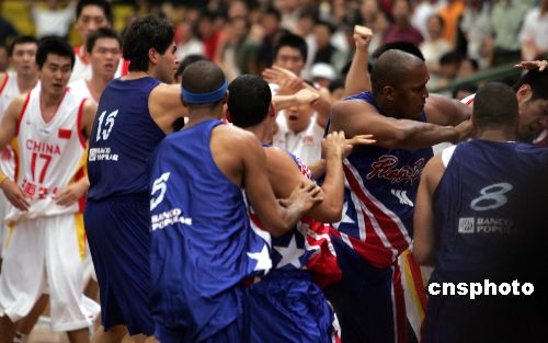 中國(guó)男籃7月29日在北京舉行的斯坦科維奇洲際杯比賽中與波多黎各隊(duì)激戰(zhàn),在比賽還剩一分多鐘、中國(guó)隊(duì)91比80領(lǐng)先時(shí),由于波多黎各隊(duì)對(duì)中國(guó)隊(duì)易建聯(lián)惡性犯規(guī),雙方發(fā)生肢體沖突。作者:任晨鳴
