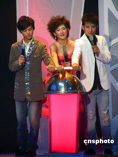 7月30日晚,陪伴中國觀眾走過8年歲月的娛樂節(jié)目《快樂大本營》進(jìn)行了改版晚會(huì),快樂主持群何炅(左)、李維嘉(右)、謝娜進(jìn)行了一場告別演唱會(huì)。在接下來的一個(gè)月里,他們將通過觀眾短信票選來決定誰能繼續(xù)留任。圖為快樂主持群一起開通短信支持通道。作者:鄧霞