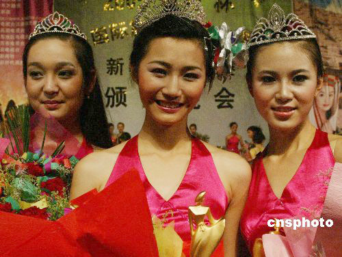 七月三十一日晚,“龜茲杯”2006國際旅游小姐新疆區(qū)總決賽在南疆阿克蘇市舉行,四十名入圍佳麗在決賽上展示泳裝、民族服飾以及晚裝,經(jīng)角逐來自烏魯木齊市的選手付苓獲得大賽冠軍(中)、梁爽獲得亞軍(右)、維吾爾族選手妮魯拜爾獲得季軍。作者:錢興強
