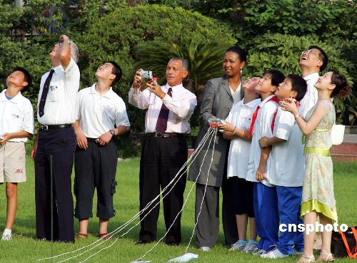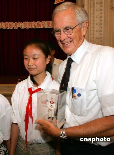 正當美國“發(fā)現(xiàn)號”航天飛機遨游太空吸引全球目光時,八月一日,“發(fā)現(xiàn)號”的前指令長查爾斯·博爾登(左四)、曾隨阿波羅號登月的航天員查爾斯·杜克(左二)、美國首位黑人女航天員梅·杰米森(左五)來到上海中福會少年宮,與上海少年航天愛好者見面。