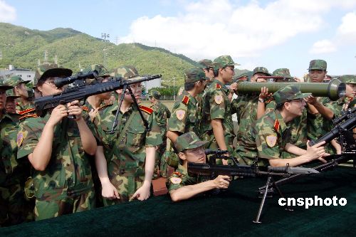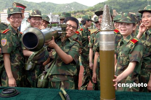 | 三日,“澳門青年學(xué)生軍事夏令營(yíng)”在駐澳部隊(duì)珠;嘏e行開(kāi)營(yíng)儀式,這是澳門特別行政區(qū)政府與解放軍駐澳部隊(duì)首次共同舉辦的軍事夏令營(yíng)。軍訓(xùn)中女學(xué)員扛起98式反坦克火箭連用發(fā)射器“有型有款”。作者:梁永強(qiáng)