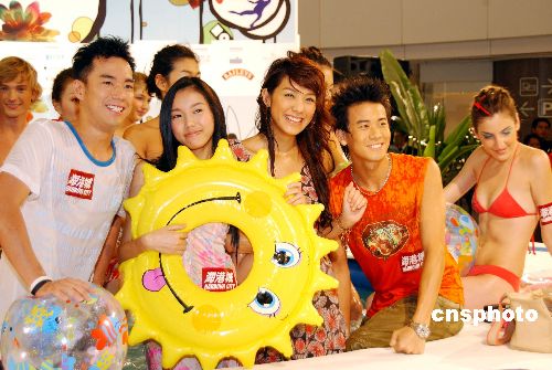 8月3日,香港人氣偶像歌星官恩娜[中]及小師妹梁雨恩[左二],以夏日色彩妝扮出席海港城舉辦的夏日派對。作者:洪少葵