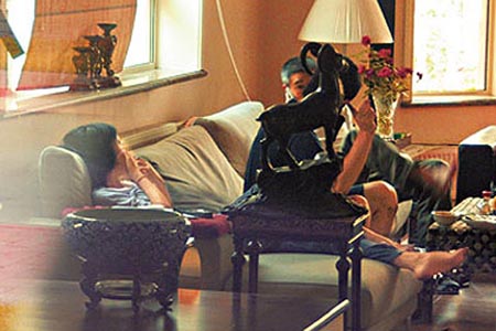 第二日,王菲與李亞鵬在第二日下午四時先起身,穿住T恤長褲,人字拖的王菲,與短衫短褲的李亞鵬由二樓睡房下到地下客廳,懶慵慵身貼身“攤”在巨型梳化上,“腳印印”看電視送“早餐”。由于二人婚前已同居一段時間,所以感覺相當(dāng)老夫老妻。當(dāng)發(fā)現(xiàn)有記者拍照時,王菲反應(yīng)相當(dāng)敏捷,即時通知老公,并用手掩面,因不防有此一招,原本吊在她腳尖上的人字拖,亦在慌忙中飛脫落地下。