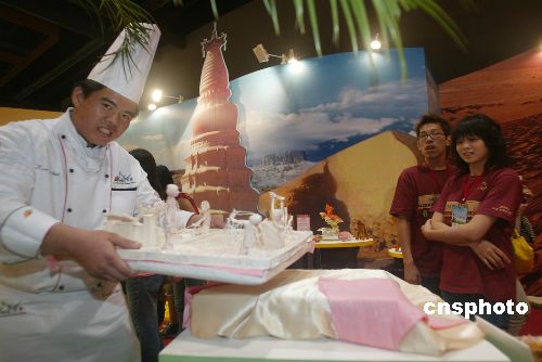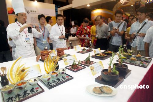 八月四日,二○○五年臺(tái)北“中華美食展”在臺(tái)北世貿(mào)中心開幕,在美食展中舉行的廚藝邀請(qǐng)賽中,來自大陸的廚師展示了精湛廚藝,吸引了不少參觀者,也吸引了同行來學(xué)藝。作者:盛佳鵬