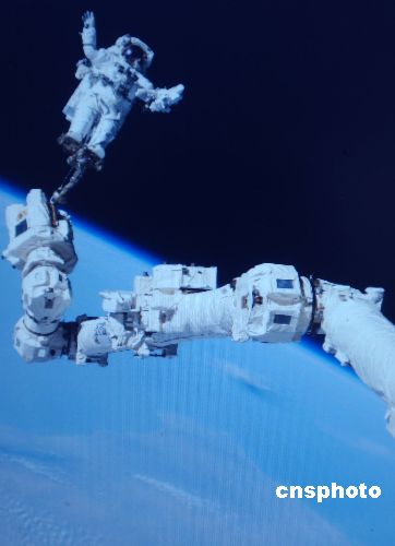八月七日在“發(fā)現(xiàn)”號航天飛機(jī)告別國際空間站向著地球返航時,美國航空航天局(NASA)播發(fā)了精彩照片回顧:技高膽大的宇航員羅賓遜完成太空行走,站在機(jī)械臂頂端如太空雜技演員。作者:賈國榮(翻拍)