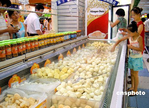 | 8月7日,中國食品科學(xué)技術(shù)學(xué)會(huì)專家委員會(huì)委員、天津商學(xué)院食品工程系教授張坤生近日指出,散裝速凍食品存在明顯的安全隱患。散裝銷售,無論是在銷售人員拆除大包裝散賣時(shí),還是顧客挑選過程中,都不可避免人與食品的接觸,造成細(xì)菌污染;而散裝食品與空氣接觸面積大,還會(huì)造成水分蒸發(fā)、產(chǎn)品干裂與油脂的氧化、酸敗等現(xiàn)象,同時(shí)空氣中存在的微生物、病毒等很可能污染食物,導(dǎo)致食用不安全。圖為顧客在超市選購散裝速凍食品。作者:張和平