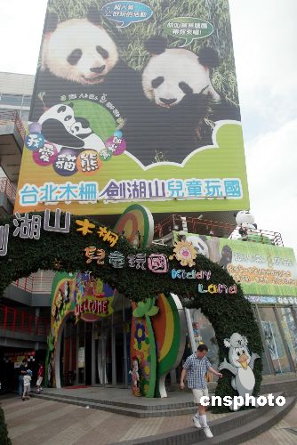 八月九日,臺(tái)北木柵劍湖山兒童玩國(guó)正在進(jìn)行“我愛(ài)貓熊寓教展”,其游樂(lè)設(shè)施從各個(gè)方面介紹大熊貓,供參觀者參觀。圖為臺(tái)北木柵劍湖山兒童玩國(guó)在門口樹(shù)立的大幅熊貓宣傳海報(bào)。作者:盛佳鵬