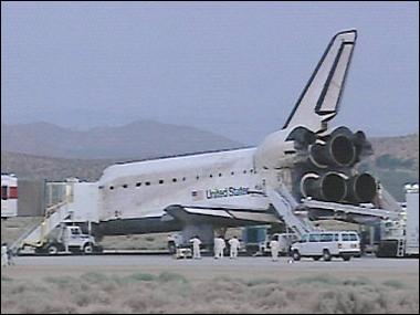 此時,航天飛機正在進行數(shù)據(jù)檢測。七位宇航員將在降落約四十五分鐘以后,才能走出機艙。