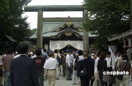 八月十五日一大早,不少日本人來到位于東京市中心的靖國神社參拜。據(jù)日本共同社報(bào)道,日本首相小泉純一郎當(dāng)天上午前往千鳥淵戰(zhàn)歿者墓苑敬獻(xiàn)花圈,預(yù)計(jì)當(dāng)天不會前往靖國神社。作者:王健