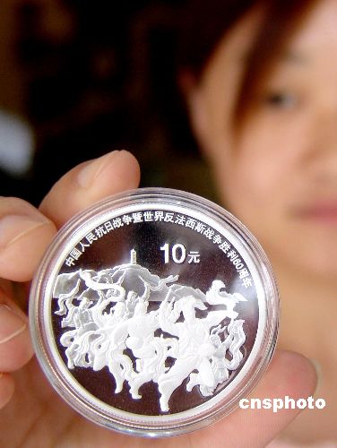 中國人民銀行于2005年8月15日發(fā)行中國人民抗日戰(zhàn)爭暨世界反法西斯戰(zhàn)爭勝利60周年金銀紀(jì)念幣一套。該套紀(jì)念幣共2枚,其中金幣1枚,銀幣1枚,均為中華人民共和國法定貨幣。作者:馬健