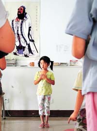 劉彩虹站在“大成至圣先師孔子像”前,帶著全班同學(xué)背誦《弟子規(guī)》。彩虹是這個(gè)班年齡最大的孩子,所以常常帶著大家朗讀課文。班里二十幾個(gè)學(xué)生,3歲到11歲不等,大都來(lái)自瓦窯村,也有幾個(gè)孩子是從城里來(lái)的。家長(zhǎng)反映,20多天下來(lái),孩子有了些變化,對(duì)長(zhǎng)輩恭敬了,知道給父母夾菜,飯后主動(dòng)幫著洗碗。