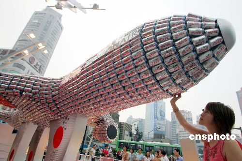 | 八月十六日,一架由數(shù)千罐“健怡可口可樂(lè)”組成的港龍航空A330飛機(jī)模型登陸上海港匯廣場(chǎng),該飛機(jī)模型長(zhǎng)八米、寬七點(diǎn)五米,完全按照真實(shí)的港龍A330飛機(jī)一比八比例打造,并由數(shù)十名能人巧匠花費(fèi)十二天的時(shí)間,用“健怡可口可樂(lè)”易拉罐精心堆砌而成。這是可口可樂(lè)公司攜手港龍航空,首度合作推出今夏精彩紛呈的網(wǎng)上有獎(jiǎng)競(jìng)猜促銷活動(dòng),惟妙惟肖的造景飛機(jī)究竟用了多少罐“健怡可口可樂(lè)”搭建而成?作者:潘索菲