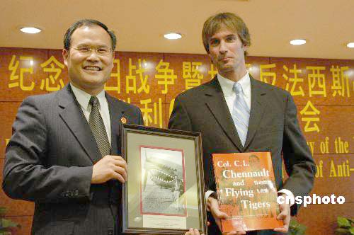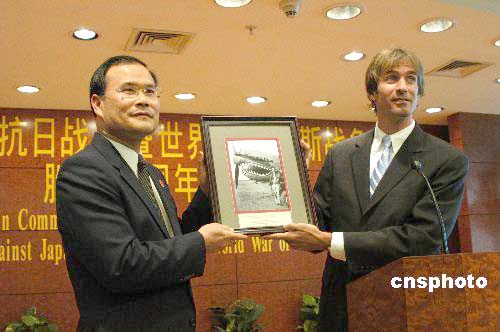 據(jù)美國《僑報》報道,在中國駐紐約總領(lǐng)館17日晚舉行的紀(jì)念抗日戰(zhàn)爭暨世界反法西斯戰(zhàn)爭勝利60周年招待會上,劉碧偉代表總領(lǐng)館,接受了這份見證中美兩國聯(lián)合抗擊法西斯侵略的珍貴紀(jì)念品。