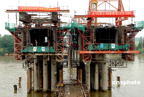 | 8月17日,江蘇揚州京杭運河大橋建設(shè)開始進(jìn)入上部箱梁澆鑄。該大橋是正在建設(shè)中的南京至南通公路上的重點工程,全長697米,經(jīng)過15個月的建設(shè),大橋下部結(jié)構(gòu)已全面完工,上部箱梁澆鑄現(xiàn)以每周4米的速度向兩邊擴(kuò)展,預(yù)計大橋?qū)⒃?1月底合攏。作者:張丙濤