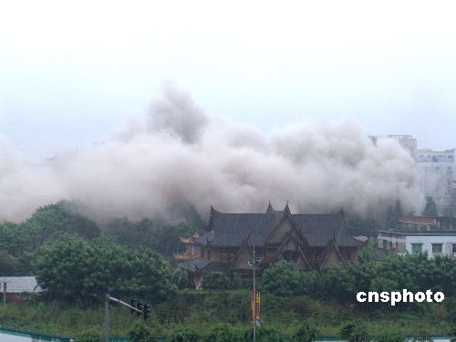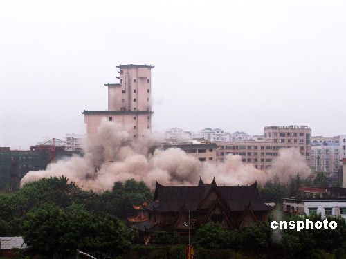 | 8月20日,永川市一幢16層高的渝西會(huì)展中心在雨中定向爆破成功。該工程是一幢16層鋼筋混凝土結(jié)構(gòu)建筑,建筑面積1.6萬平方米。爆破工程爆破用炸藥250公斤,爆破總延時(shí)4.5秒,坍落時(shí)間持續(xù)約10秒鐘。樓體采取兩次折疊,四區(qū)爆破,實(shí)行定向折疊坍塌。此次爆破是重慶永川市區(qū)乃至西南地區(qū)建筑史上最大規(guī)模的爆破拆除工程。作者:陳仕川