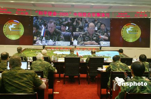8月20日,參加聯(lián)合軍演的中俄雙方指揮員在導(dǎo)演部大廳觀摩第二階段演習(xí)。當(dāng)日,“和平使命——2005”中俄聯(lián)合軍事演習(xí)第二階段——戰(zhàn)役籌劃階段在中國青島開始。作者:王麗南