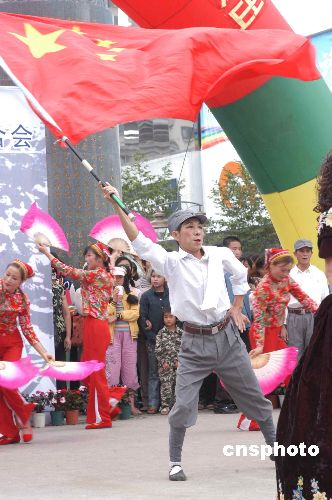 人日二十一日,昆明市紀念反法西斯戰(zhàn)爭暨抗日戰(zhàn)爭勝利六十周年文藝演出活動在市中心廣場舉行。圖為群眾演出團體演員,身穿八路軍服裝,表現(xiàn)全民抗戰(zhàn)的歷史場景。作者:鄒憲