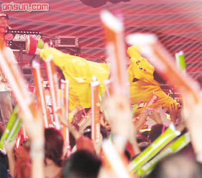 在壓軸合唱部分,達明換了睡袍造型,霆鋒不示弱,即場脫衣拋下臺,露出當年和王菲“比翼雙飛”愛的紋身,又用水淋頭,拗腰彈跳;high到震的他,然后用國語連問兩次站在臺前的大陸fans:“你們會接我嗎?”即飛身下臺,全場嘩然,霆鋒和前排觀眾跌在一堆,形成一個凹字,嚇到正在唱歌的明哥目瞪口呆,馬上叫大會:“停一停音樂!泵蛦枺骸蚌h有沒事?”現(xiàn)場燈光大,保安和助手紛紛走近察看霆鋒,隔了半分鐘,霆鋒才跳上臺,連鞋都甩開,赤腳說:“不好意思,讓大家擔心,你們有沒事?我還好,如果你們有事,我不會再在香港演出,你們真的OK?”幸沒人受傷,不致樂極生悲。