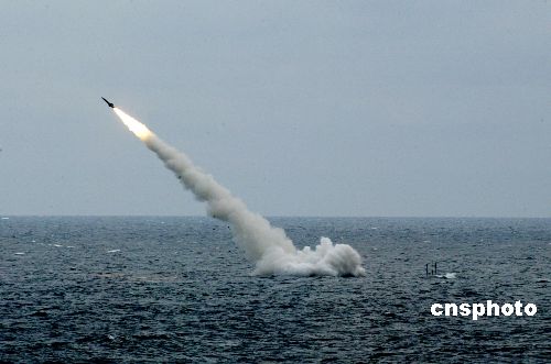 二十三日,“和平使命——2005”中俄聯(lián)合軍事演習(xí)第三階段——實施交戰(zhàn)的海上封鎖演練在中國黃海海域進行。圖為中國新型潛艇水下發(fā)射導(dǎo)彈出水瞬間。作者:王麗南