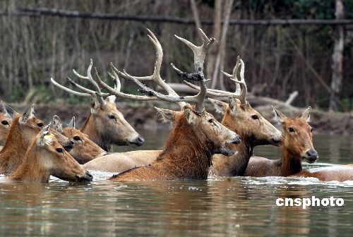 | 八月二十三日,北京麋鹿生態(tài)實驗中心內(nèi)的麋鹿在悠閑地在水中乘涼。麋鹿作為國家一級保護(hù)動物,世界“受危級”物種,曾僅產(chǎn)中國。清末,由于天災(zāi)人禍,麋鹿作為一個物種,在中國滅絕了。幸有少量個體在其滅絕之前被引種到歐洲,最終在英國繁衍下來。1985年,麋鹿結(jié)束百年“華僑”生涯,回歸故里——中國北京。二零零五年麋鹿返家二十周年之際,數(shù)量已達(dá)到二千頭左右。作者:張宇