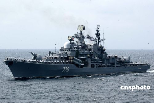 “和平使命-2005”中俄聯(lián)合軍事演習(xí)第三階段8月23日在中國(guó)山東半島及其附近海域開(kāi)始。圖為參加演習(xí)的俄艦艇,接受聯(lián)合導(dǎo)演部檢閱。作者:王麗南