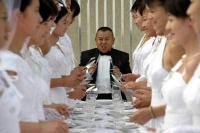 昨天,奧體中心游泳館的一個(gè)平臺(tái)上,一下子出現(xiàn)了三十位身穿白色婚紗的新娘,這個(gè)場(chǎng)面難道是有人在這里組織集體婚禮?看到一旁的攝影機(jī),才知道原來(lái)這里是潘長(zhǎng)江處女專輯《男人40一枝花》同名歌曲MV的拍攝現(xiàn)場(chǎng)。一張長(zhǎng)條桌子兩側(cè)站著30位漂亮的新娘,而眾星捧月之中是身穿黑色燕尾服的笑星潘長(zhǎng)江。最搞笑的是當(dāng)老潘揭開面前一只巨大的盤子蓋,原以為是大餐的他失望地發(fā)現(xiàn)里面只放著一個(gè)小漢堡。