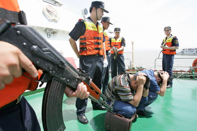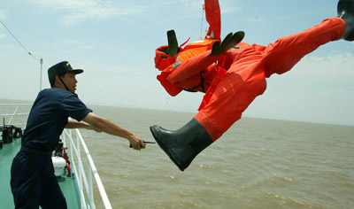 在這次演習(xí)中,靠幫和跳幫是緝私隊員著重鍛煉的兩個技術(shù)動作!吧嫦幼咚酱遣粫怨月犜捵屛覀兛可先サ!焙贾莺jP(guān)緝私局海查科長楊政說。今年1月,舟山緝私分局的一艘緝私艇在追擊一艘涉嫌走私冰凍白魚的漁船時,漁船邊逃邊擺尾,緝私艇根本無法靠船跳幫。追擊了一天一夜后,在溫州緝私分局一艘緝私艇的夾擊下才終于靠近漁船,緝私隊員在兩船起伏落差較大情況下跳幫過去,控制住了走私漁船。