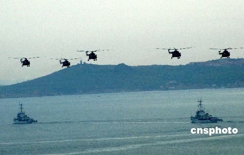 八月二十四日,“和平使命—2005”中俄聯(lián)合軍事演習第三階段兩棲登陸作戰(zhàn)實兵演練在山東半島展開。圖為直升機呈梯級在艦艇上空盤旋掩護艦艇向岸防挺進。作者:王麗南