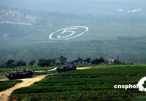 八月二十四日,“和平使命—2005”中俄聯(lián)合軍事演習(xí)第三階段兩棲登陸作戰(zhàn)實(shí)兵演練在山東半島展開(kāi)。圖為參加兩棲登陸作戰(zhàn)實(shí)兵演練的裝甲運(yùn)兵車登陸后,向縱深挺進(jìn)。作者:王麗南