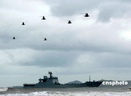 八月二十四日,“和平使命—2005”中俄聯(lián)合軍事演習(xí)兩棲登陸作戰(zhàn)實兵演練在山東半島展開。圖為參加兩棲登陸作戰(zhàn)演練的直升機在風(fēng)云變幻的海天間掩護俄羅斯艦艇前進。作者:王麗南