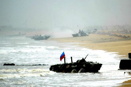 八月二十四日,盡管山東半島天氣惡劣“和平使命—2005”中俄聯(lián)合軍事演習兩棲登陸作戰(zhàn)實兵演練如期進行。圖為參加兩棲登陸作戰(zhàn)演練的裝甲車搶灘后,穿過炮火前行。作者:王麗南