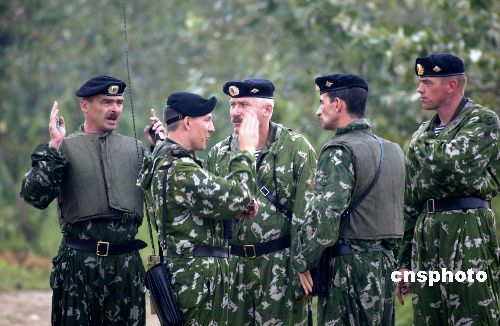 | 八月二十四日,“和平使命—2005”中俄聯(lián)合軍事演習(xí)兩棲登陸作戰(zhàn)實(shí)兵演練在山東半島如期進(jìn)行。圖為完成登陸任務(wù)后的俄羅斯陸戰(zhàn)隊(duì)軍官,交流任務(wù)完成情況。作者:王麗南