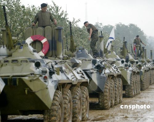 八月二十四日,“和平使命—2005”中俄聯(lián)合軍事演習(xí)兩棲登陸作戰(zhàn)實兵演練在山東半島如期進行。圖為完成登陸任務(wù)后的俄羅斯陸戰(zhàn)隊員,盡管全身濕透,仍很仔細地檢查車輛性能情況。作者:王麗南