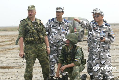 “和平使命-2005”中俄聯(lián)合軍事演習(xí)最后一個(gè)實(shí)兵行動(dòng)課目——強(qiáng)制隔離作戰(zhàn)演練,25日上午在濟(jì)南軍區(qū)濰北靶場舉行。圖為中俄空軍軍官在演習(xí)區(qū)域交流任務(wù)完成情況。作者:王麗南