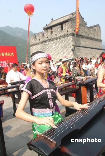 八月二十六日,居庸關(guān)長(zhǎng)城琴聲悠揚(yáng),身著56個(gè)民族盛裝的古琴演奏者,在天下第一雄關(guān)用鐫刻著56個(gè)民族歷史文化和風(fēng)情習(xí)俗的56把極品古琴演奏了《梅花三弄》、《流水》、《關(guān)山月》《歌唱祖國(guó)》等千古名曲和時(shí)代新歌,慶祝中華人民共和國(guó)建國(guó)56周年。張勤